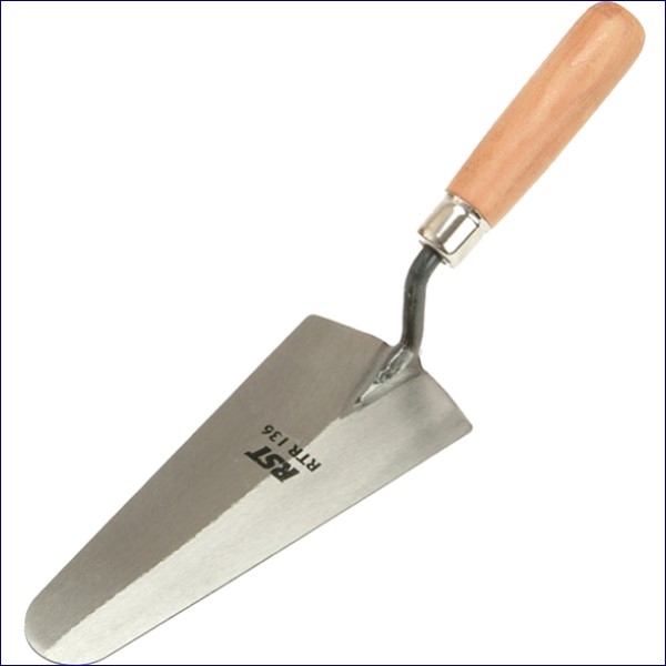 R.S.T. Gauging trowel with a traditional wooden handle and carbon steel blade. Used primarily for mixing and applying small quantities of cement.