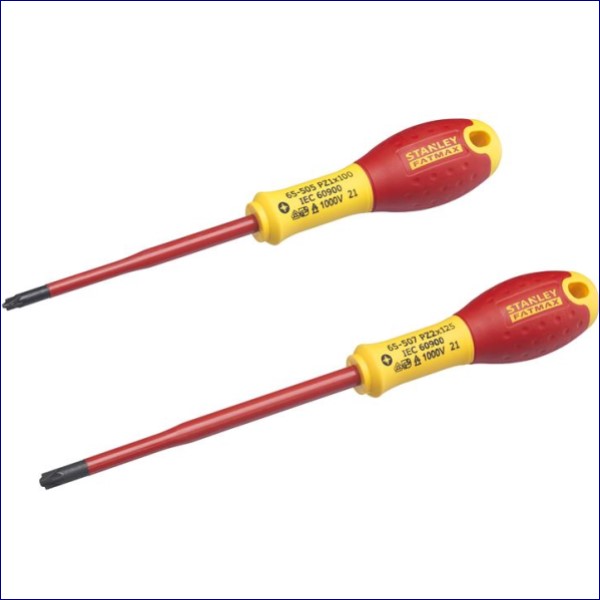 Stanley FatMax® VDE Insulated Screwdrivers feature slim insulation which allows access without modification and safe working to 1,000 Volts. Their tri-material handles with soft grip provide torque transmission and control. Hardened tips ensure a longer working life.