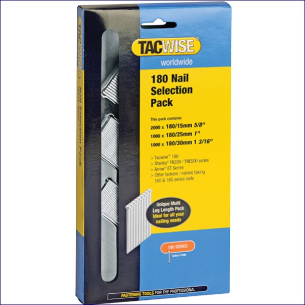 The Tacwise 180 Nail Selection Pack is ideal for all your nailing needs. Contains: 2,000 x 15mm, 1,000 x 25mm and 1,000 x 30mm.