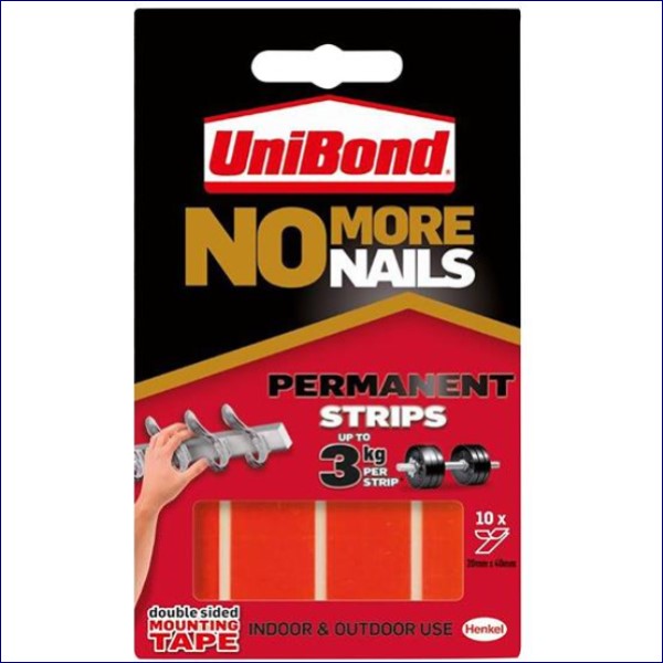 The Unibond 781740 holds up to 2.75Kg per strip and is suitable for both interior and exterior use. It is ideal for mounting hooks, signs, numbers, pictures, cable trunking, bathroom and car accessories.