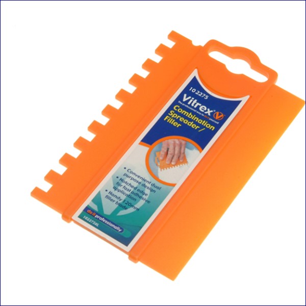 The Vitrex 10 2275 Combination Spreader/Filler has a convenient dual purpose design. It has a notched edge for fast adhesive application and a handy 120mm filler blade.
