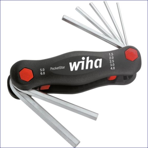 This Wiha PocketStar Hex Key Set has seven hex L-keys made of through hardened, Chrome-vanadium steel with an electro-plated finish. Stored in a handy, space-saving folding holder.