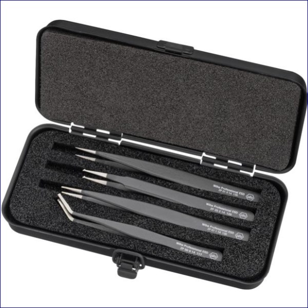 This Wiha Professional ESD SMD Tweezer Set are for the most common applications. Electrostatically conductive tools protect electronic components from damage. Conforms to DIN EN 61340-5-1.